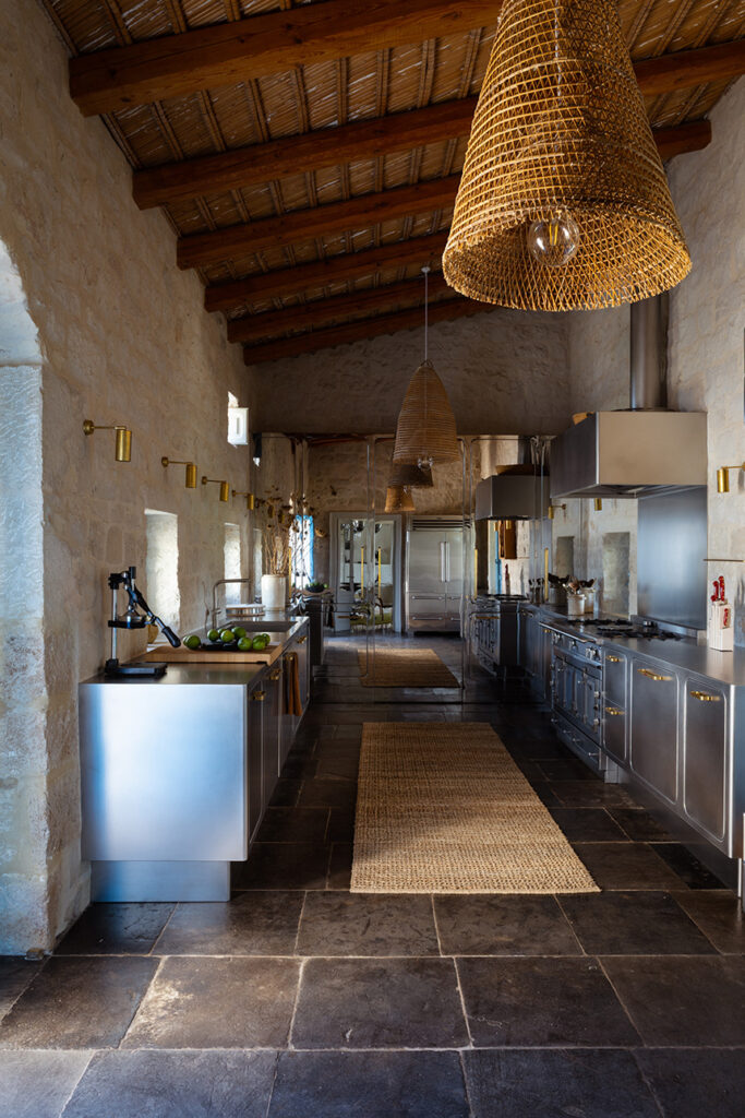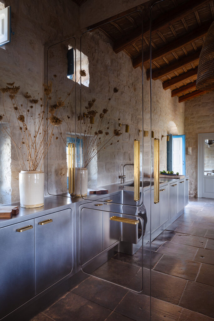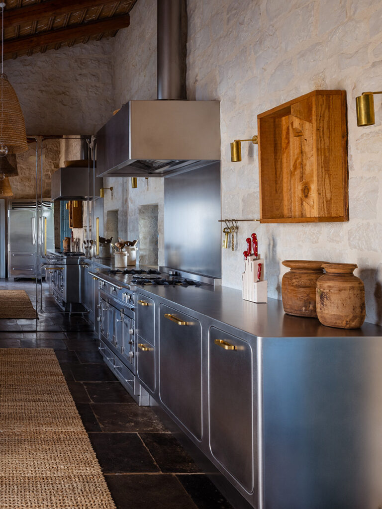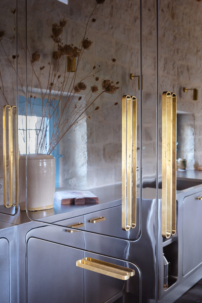 El acero inoxidable trabajado artesanalmente refleja la luz de forma suave, dialogando con la superficie irregular de la piedra y el suelo oscuro. Los tiradores redondeados, característicos de la línea Ego, reinterpretados también como prácticos soportes para utensilios y realizados en acabado latón, introducen una nota cálida que conecta con los tonos naturales del entorno y los detalles de iluminación, generando un elegante contrapunto matérico.