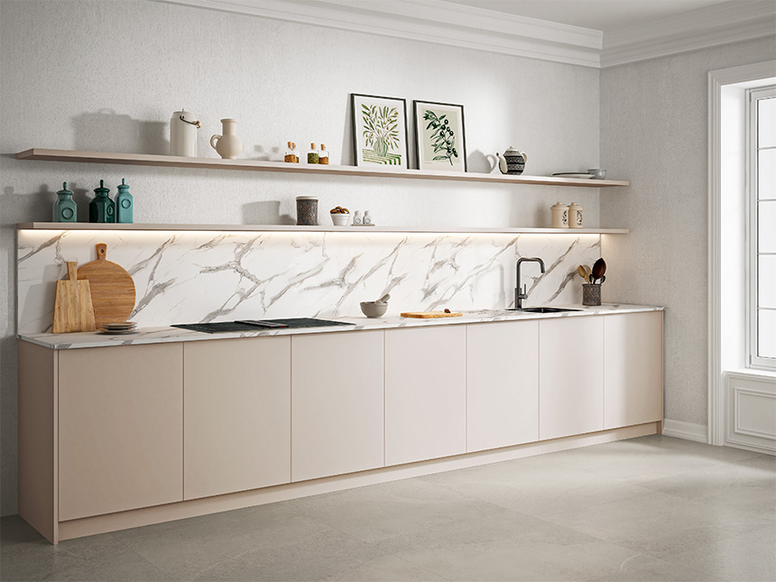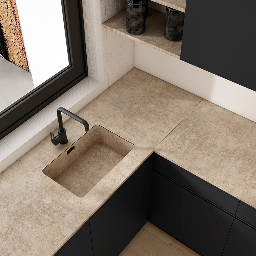 La estructura de Twin la conforman tres niveles que fusionan superficies compactas en las capas superior e inferior con un núcleo de aglomerado en el interior. Esta configuración hace posible mantener la resistencia del compacto y mejorar la estabilidad de la encimera, a la vez que reduce su peso – 35% más ligera que el cuarzo o el porcelánico – y facilita su manipulación sin necesidad de disponer de maquinaria especializada.