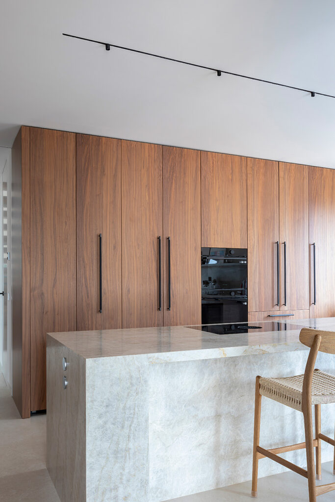 El espacio se articula en torno a una de las colecciones más distintivas de Cesar, el mencionado modelo Intarsio. Su mayor particularidad es su diseño en madera con vetas dispuestas en dos direcciones, que logran un efecto gráfico y un fuerte carácter estético. En este proyecto, los muebles bajos muestran tiradores Ouverture de Cesar en acabado bronce, mientras que los de las columnas son tiradores Buster & Punch. La zona del desayunador se presenta en el acabado melamina Canapa, proporcionando ligereza visual y armonía de color.