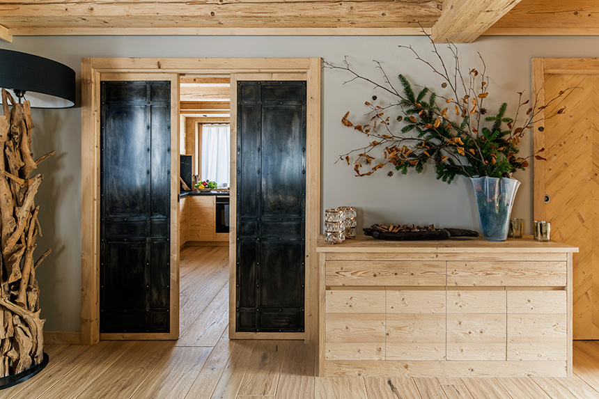 La cocina, diseñada a medida, actúa como núcleo visual y funcional de la zona de día. Definida por la Quarzite Nera de Antolini, perteneciente a la Exclusive Collection y trabajada con acabado Leather, la encimera aporta profundidad cromática, resistencia y una fuerte presencia escultórica. Su textura natural dialoga con la madera de abeto cepillado y el hierro envejecido, integrándose con naturalidad en el lenguaje alpino contemporáneo del proyecto.