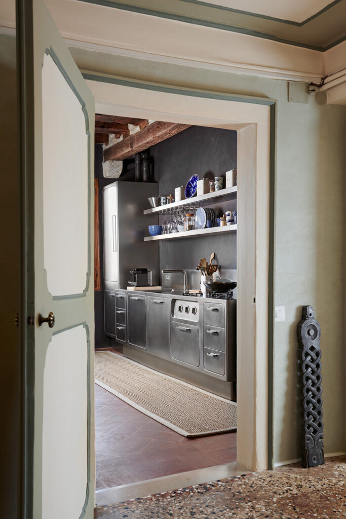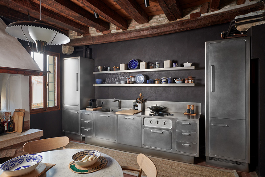 Diseño italiano, acero inoxidable a medida y artesanía contemporánea se unen en esta cocina Ego de Abimis en Venecia, un proyecto exclusivo que reinterpreta la alta cocina doméstica en un palacio del siglo XVIII.