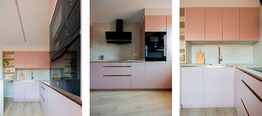 A primera vista, lo que capta la atención es la paleta rosa predominante: mobiliario bajo y parte de los muebles altos en rosa mate combinado con detalles en madera natural clara. La elección del rosa matifica la percepción visual, evitando una presencia exagerada de brillos. El ambiente se intuye íntimo y acogedor, pero sin dejar de ser moderno.