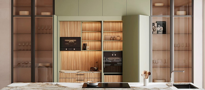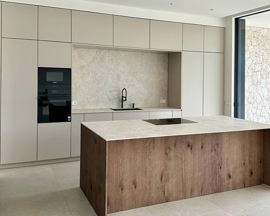 Esta mezcla de materiales (madera + piedra, lacados mate + vitrinas, metal cálido en detalles) permite crear cocinas con más personalidad y un punto artesanal, incluso dentro de líneas modernas.