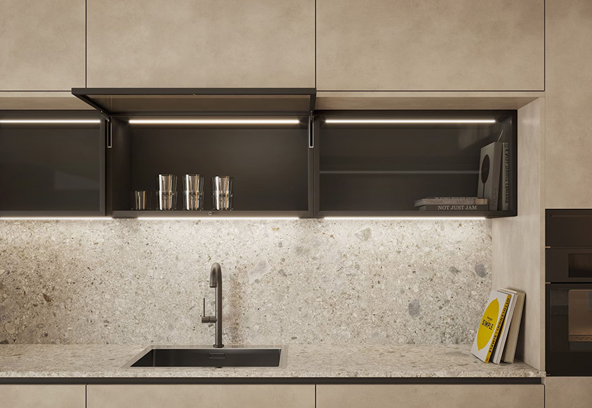 Los acentos en negro continúan, pero ganan terreno los metales cálidos (latón, cobre cepillado) y los tonos piedra, que armonizan con encimeras minerales y revestimientos con relieve.