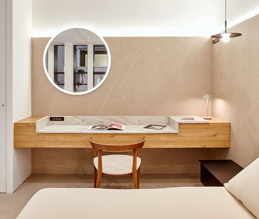 En cuanto a la habitación, presentaba un envolvente interior de paredes y suelos en Dekton Adia, acompañado por un cabecero y mobiliario de cama realizados en Dekton Sirius. Este mismo tono se ha empleado también para crear un vestidor con estructura de huecos o nichos. El uso de Dekton se completaba con las superficies de las mesas bajas. Por último, la estancia incluía un escritorio confeccionado en cuarcita Vancouver de Sensa.