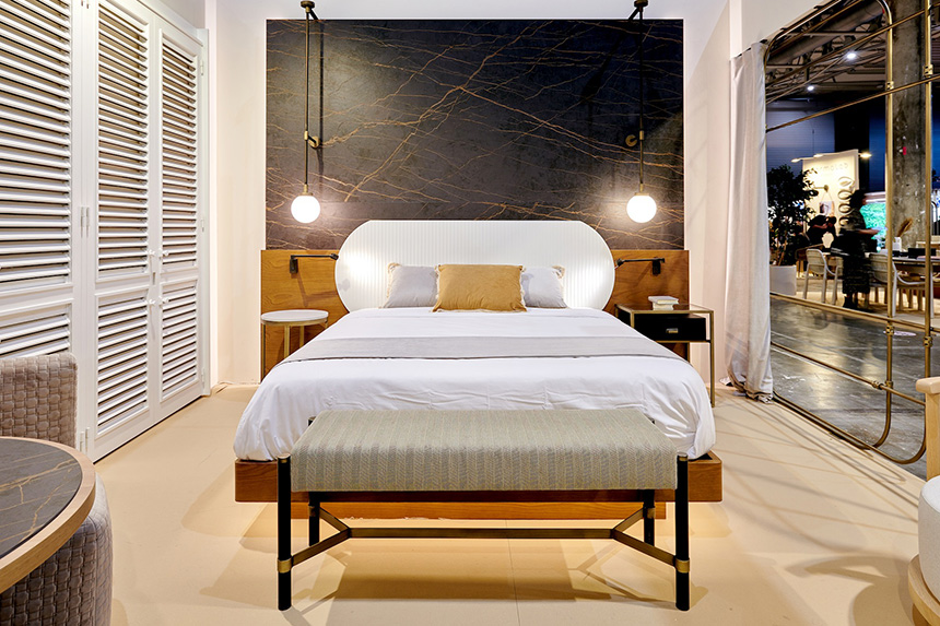 Para la decoración del espacio se contó con la colaboración de las firmas Dornbracht, Speho y Vibia. Además, como en ediciones anteriores, los productos de Cosentino trascienden su propio stand, participando en diseños y aplicaciones creados por otras marcas destacadas. Un ejemplo es la empresa de contract Monrabal Chirivella, que utilizó Dekton Laurent para revestir en gran formato una pared-cabecero de habitación y como superficie de mesa; o las firmas SKLD y Voolcan, que integraron una mesa en Dekton Nebbia y un lavabo en Silestone Ethereal Glow, respectivamente.