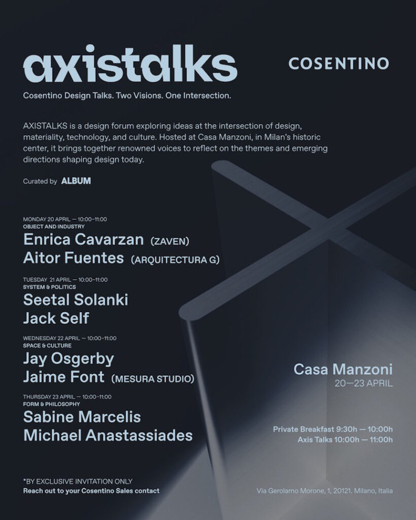 Ubicada en Casa Manzoni, esta exposición explora, a través de cinco espacios conceptuales, una dimensión diferente de lo material, la forma y la percepción. Además, durante esta semana, el espacio acoge los AXIS Talks con diseñadores internacionales, como Sabine Marcelis, Michael Anastassiades, Jaime Font (Mesura Studio) o Enrica Cavarzan, entre otros.