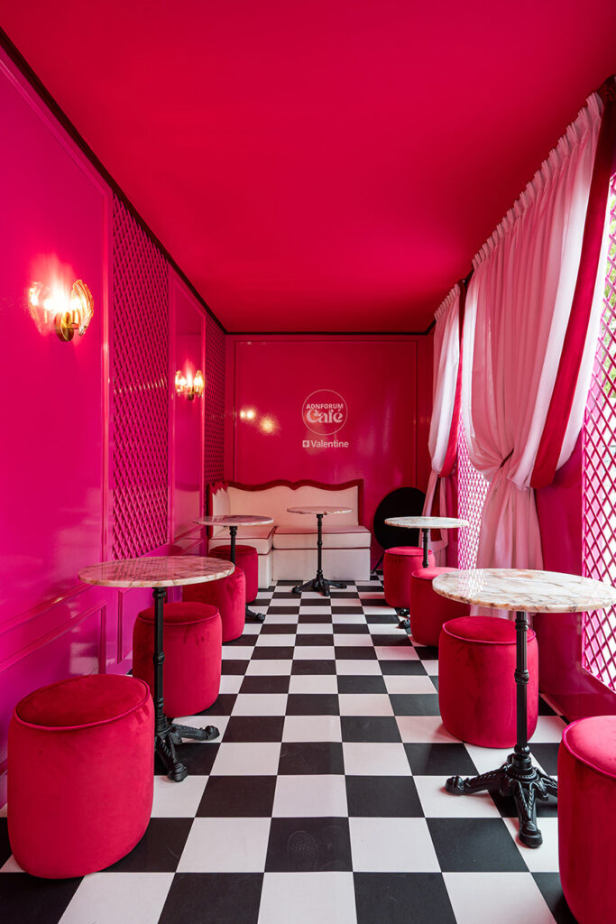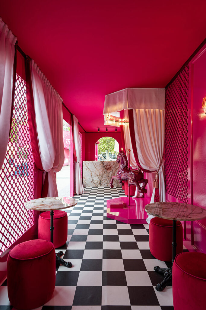 El contenedor se convirtió en una experiencia sensorial donde los elementos respondían a una lógica de armonía. Así, el color rosado Vibrant Pink de Valentine, se encargaba de envolver el espacio, mientras que la piedra natural de Cupa Stone proporcionaba textura, serenidad, naturaleza y luz.