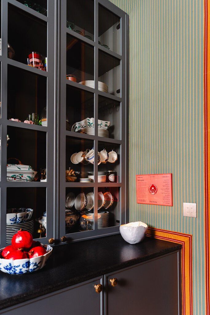 En esta antesala se instalan dos muebles hechos a medida: una vitrina para vajillas y un área de lavabo funcional. Estos dos elementos, lacados en el mismo gris azulado se adhieren a las encimeras de piedra natural Granito Dante Silk de Cupa Stone. Este material de gran solidez cierra el círculo que resalta el acabado de cada uno de los elementos.