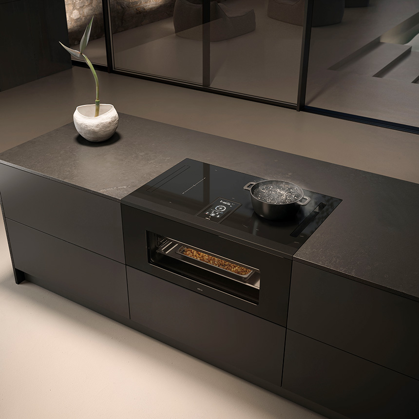 También diseñado por Fabrizio Crisà, innova integrando horno, placa y sistema de extracción en un mismo electrodoméstico.