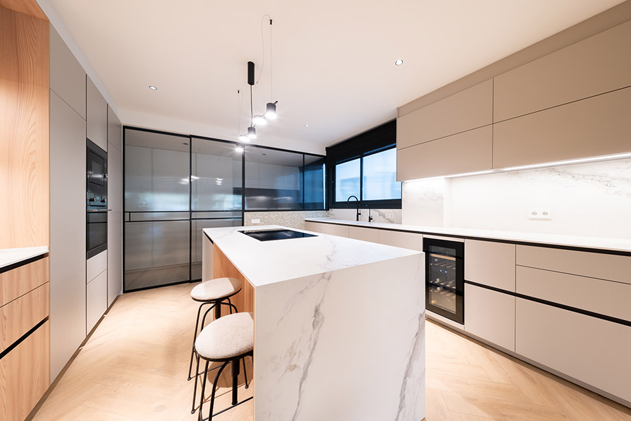 De este modo, Estudi Esteve proyectó una cocina organizada como un espacio semiabierto, separado del resto de la vivienda mediante dos carpinterías de aluminio lacado en negro con vidrio acanalado, realizadas a medida por el fabricante Lasser. Así, cada divisoria está compuesta por un elemento fijo y una puerta corredera de suelo a techo. El resultado es una cocina luminosa, con continuidad visual y , al mismo tiempo, que genera una sensación de privacidad.