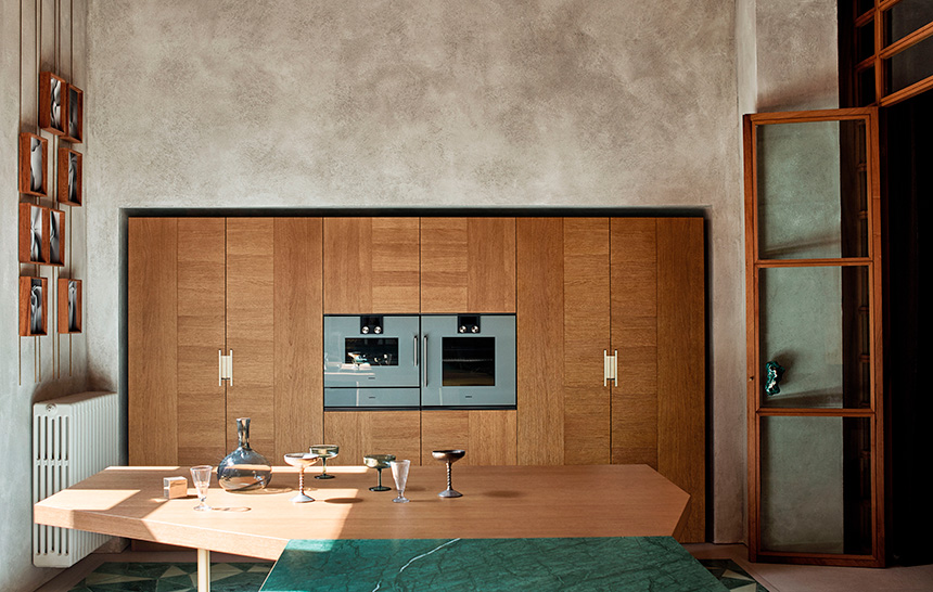 Las columnas potencian la sensación de continuidad visual mediante el uso del mismo roble Intarsio y el tirador Ouverture en aluminio Champagne cepillado. Los módulos abiertos Trilli extienden la lectura global hacia la zona de día, aportando ligereza y funcionalidad. La composición se completa con piezas adicionales como la mesita Unit con encimera de mármol Verde Guatemala, estructura en aluminio negro y base en níquel negro pulido, que llevan el lenguaje material más allá del espacio estrictamente operativo.
