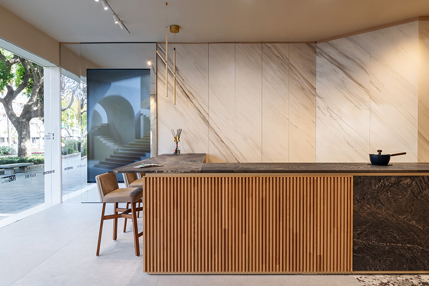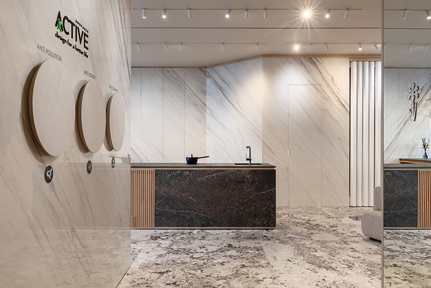 La Material Library, que reúne una amplia selección de colecciones y acabados, refuerza este recorrido experiencial en el que las superficies envuelven los espacios como si se tratara de una piel arquitectónica. Todo ello se potencia gracias a tecnologías propias como Hypertouch —superficies inteligentes integradas en sistemas domóticos—, Attract —instalación magnética 100% reutilizable—, Moonlight —láminas retroiluminadas—, DYS —personalización avanzada del diseño—, Active Surfaces —propiedades ecoactivas antibacterianas y antipolución— y Alchimia & Iris Ceramica Group, una solución invisible que integra sistemas audiovisuales en total continuidad con la superficie cerámica.
