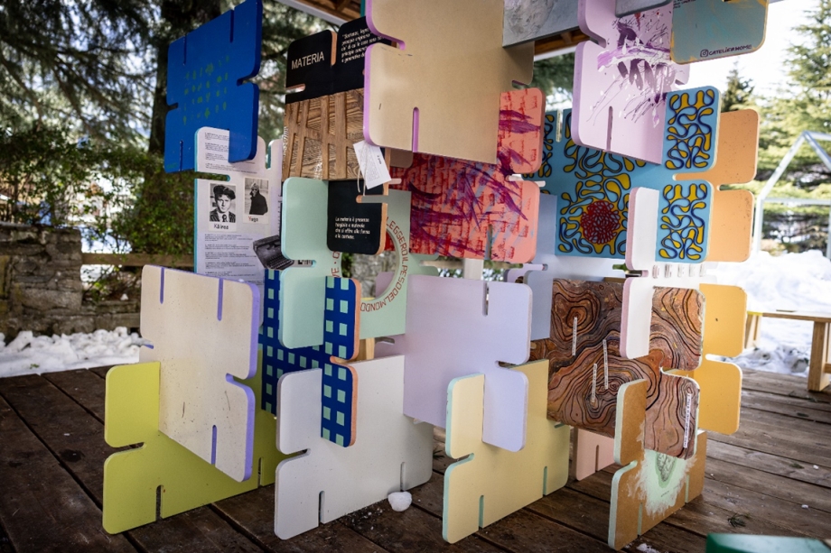 Bajo la estructura se desarrolló un proyecto especial concebido por Nicholas Bewick, Art Director de AMDL Circle: una instalación escenográfica y multifacética articulada en torno a 45 «palabras de amor». Los paneles de madera suministrados por Finsa y los barnices para exteriores Milesi sirvieron como lienzo inicial para una obra colectiva, enriquecida por la contribución creativa de decenas de diseñadores.