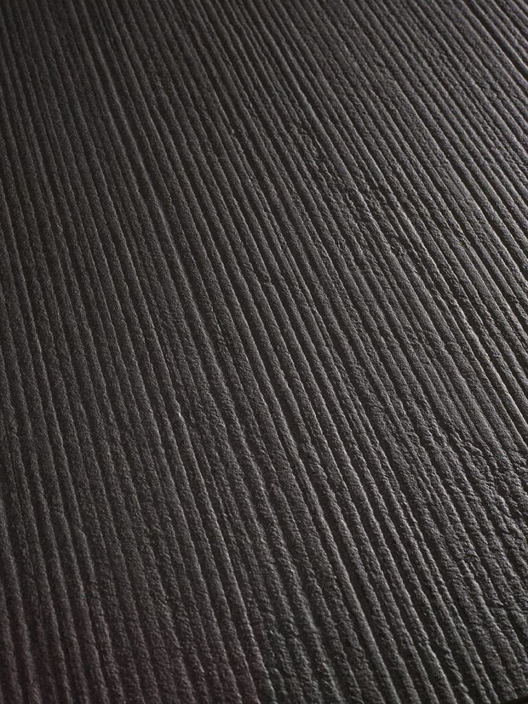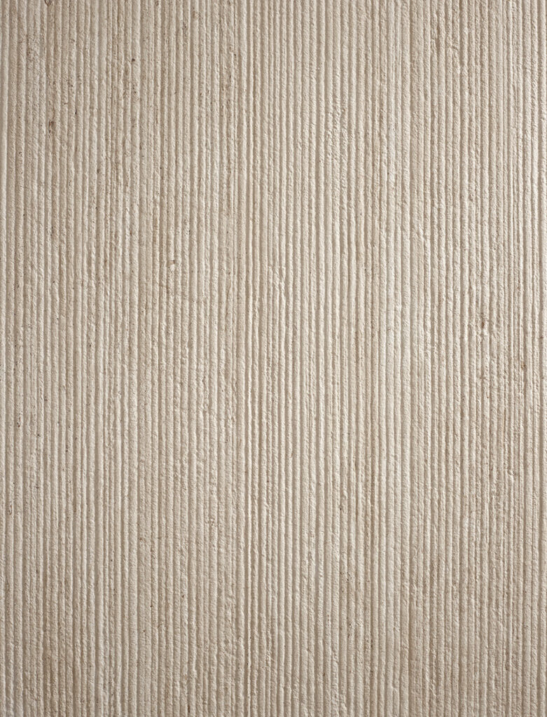 Rigato se caracteriza por un sutil relieve estriado que atraviesa longitudinalmente la superficie y recuerda a la piedra tallada a mano. Su efecto acanalado da lugar a un juego de luces y sombras mate que potencia la tridimensionalidad y la presencia visual del material, siendo el resultado escultórico y contemporáneo.