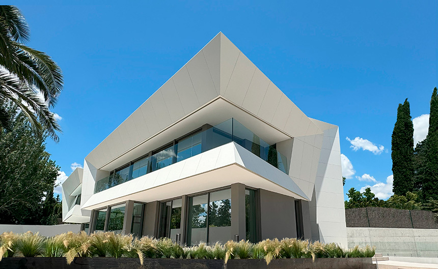 En el área residencial, una vivienda en Madrid resalta la geometría del diseño, con líneas y planos que buscan precisión y continuidad visual.