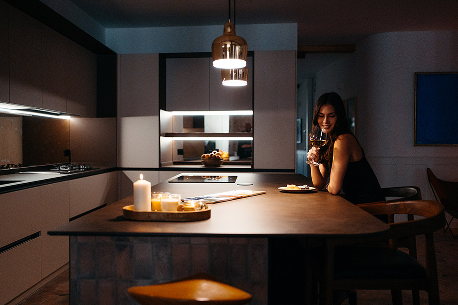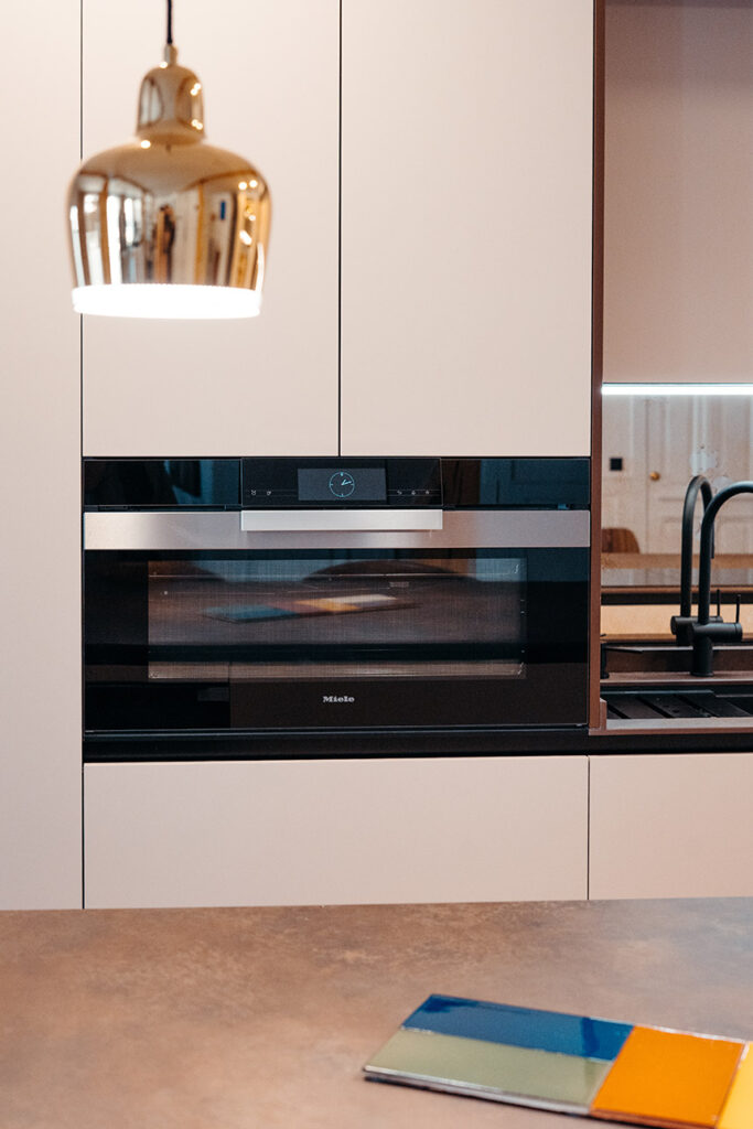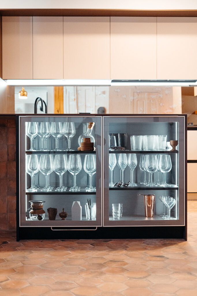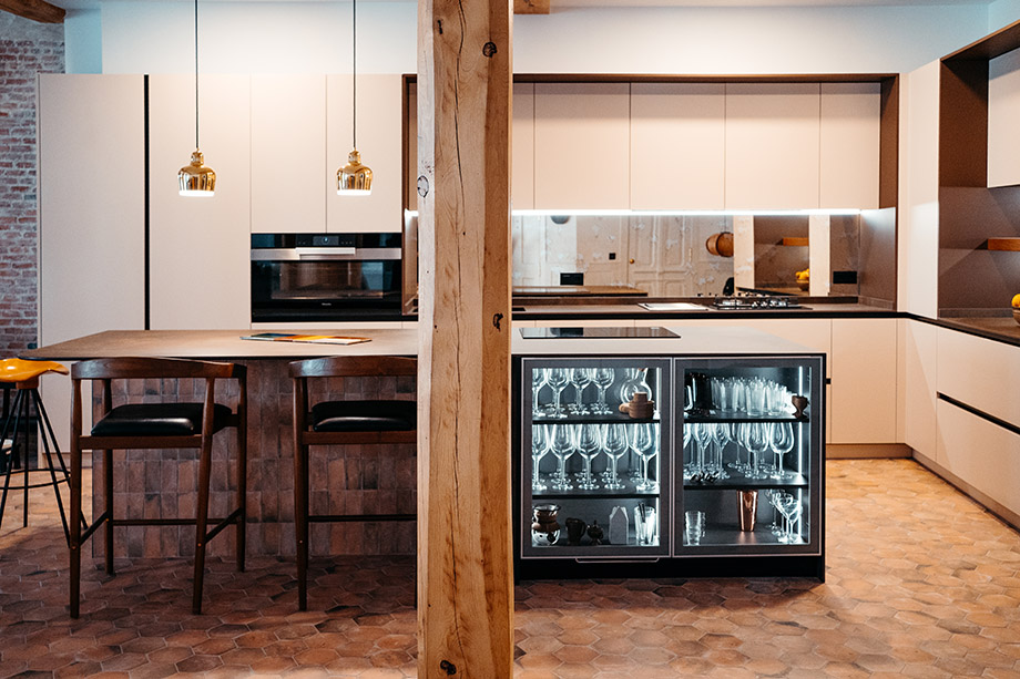 En la columna lateral se integra un horno de 90 cm, que permite recetas para numerosos invitados. Tras dos puertas de 60 cm se ocultan el frigorífico y el congelador, ambos de 320 litros de capacidad, integrados completamente en el mobiliario.