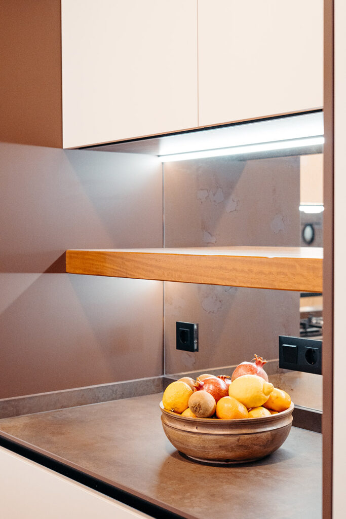 Las tiras LED bajo los muebles altos completan la iluminación, eliminando sombras durante la preparación de alimentos. El fregadero, instalado bajo encimera, crea una superficie continua que facilita la limpieza.
