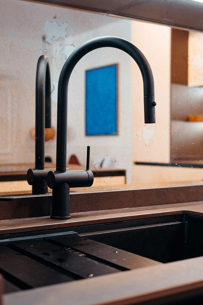 Por su parte, la encimera está realizada con Laminam Fokos Grafite en el frente lineal y desayunador. Mientras en en la isla se optó por Ceratop by Cupastone Nero Saint Laurent. La elección de porcelánico en ambas zonas responde a criterios de resistencia, higiene y mínimo mantenimiento. Destacan en la encimera de la isla unas cascadas laterales ingleteadas que refuerzan su presencia escultórica en el espacio.