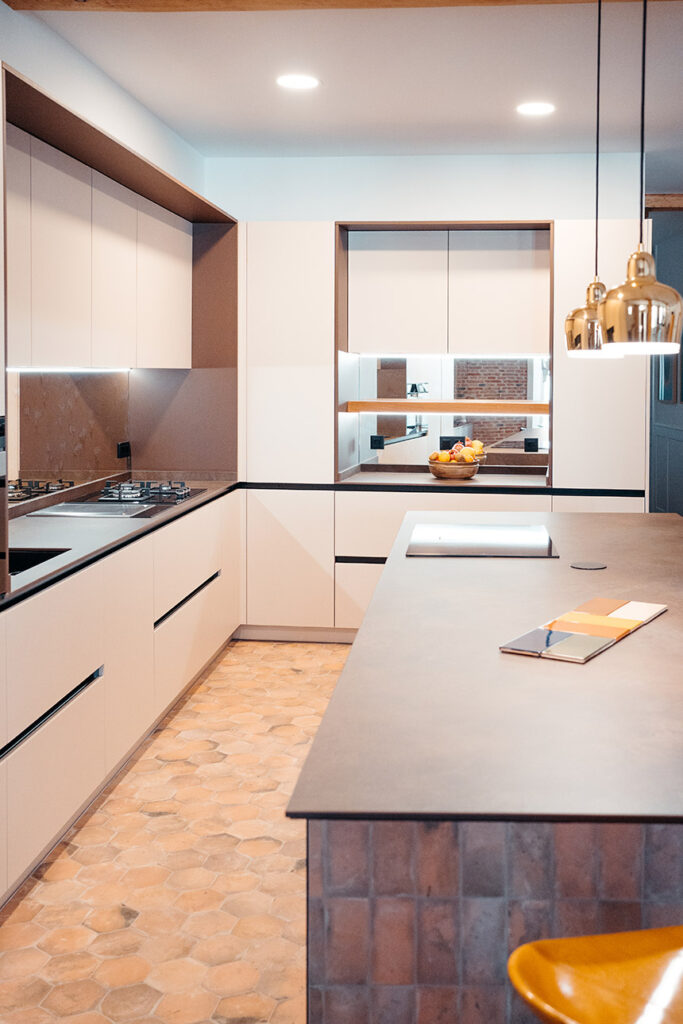El mismo porcelánico del volado de la isla se utiliza para el suelo de la cocina, generando continuidad visual. Su diseño se inspira en los suelos tradicionales mediterráneos, caracterizados por la calidez.