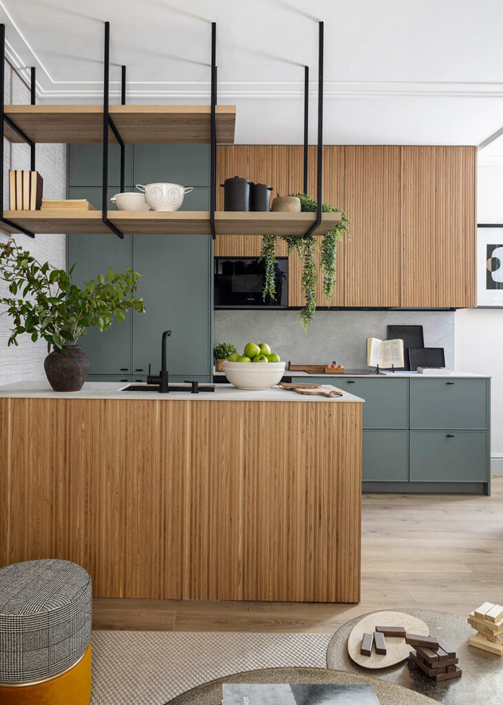 La propuesta estética combina un lenguaje contemporáneo con referencias industriales, visibles en el cerramiento de hierro, la estantería suspendida sobre la isla de la cocina y la propia escalera. Estos elementos se equilibran con materiales cálidos y continuos, como los revestimientos vinílicos en paredes y la tarima con acabado madera, que unifican visualmente la vivienda y facilitan el mantenimiento.