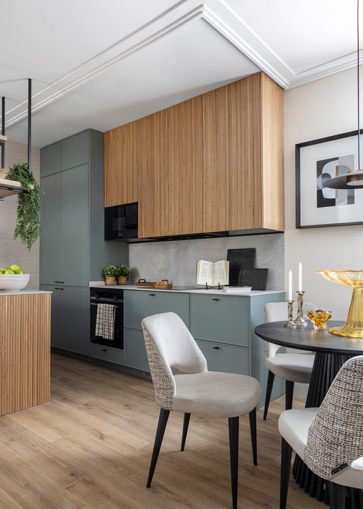 La vivienda se estructura en torno a un espacio principal abierto que integra salón, comedor y cocina en una única estancia, eliminando así barreras físicas innecesarias. Esta solución favorece una mayor sensación de amplitud y facilita la circulación, clave en viviendas de dimensiones reducidas. La cocina, concebida como un elemento central y funcional, se integra visualmente mediante materiales y acabados continuos que refuerzan la unidad del conjunto.