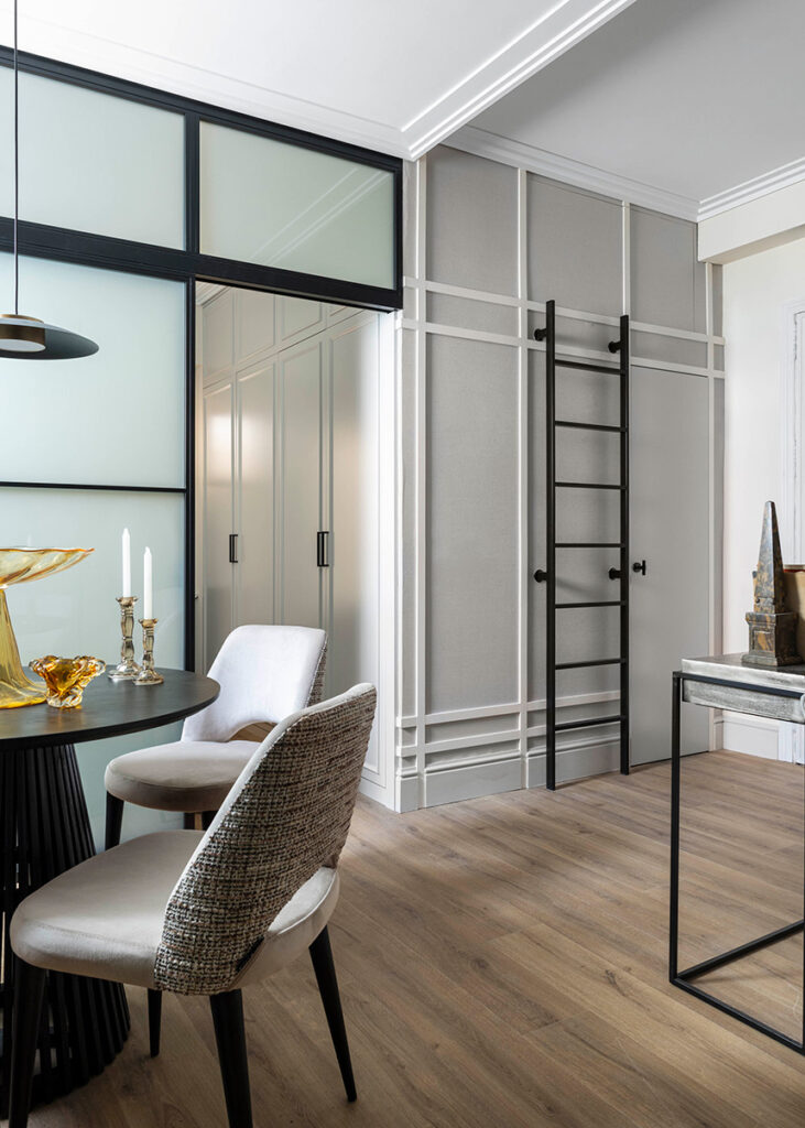 El aprovechamiento de la altura ha sido otro de los ejes fundamentales del proyecto. Con casi tres metros de altura libre, se ha diseñado un altillo destinado exclusivamente al almacenaje. Esta solución, integrada de manera discreta, permite liberar espacio en las áreas de uso diario y responde a una de las principales necesidades en viviendas pequeñas: el almacenamiento eficiente.