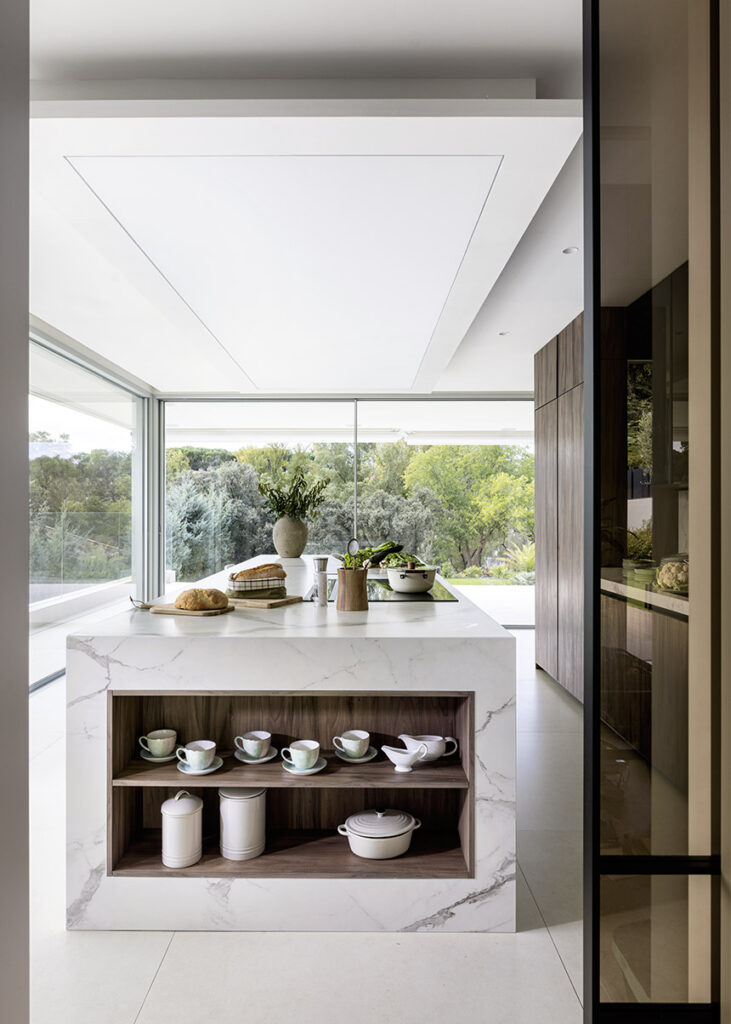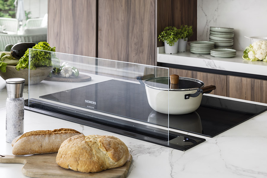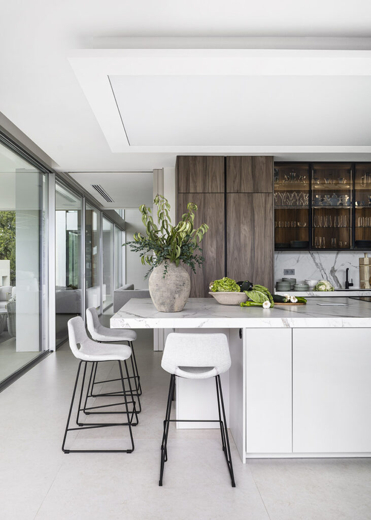 El equipamiento tecnológico se resuelve con electrodomésticos StudioLine de Siemens, completamente integrados para reforzar el concepto de “silencio visual”: una cocina donde la innovación técnica se funde con el diseño, permitiendo que la materialidad y la arquitectura sean las verdaderas protagonistas.