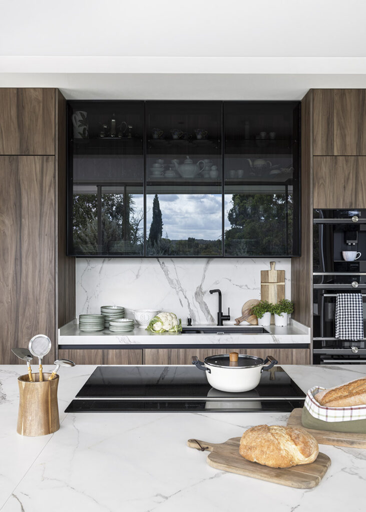 Asimismo, un elemento clave de esta cocina es la isla central, en acabado Fango, que se convierte en el eje compositivo del espacio. Su volumen rotundo contrasta con el desarrollo perimetral en Noce Imperial, aportando profundidad, textura natural y una sensación envolvente que refuerza la calidez del conjunto.