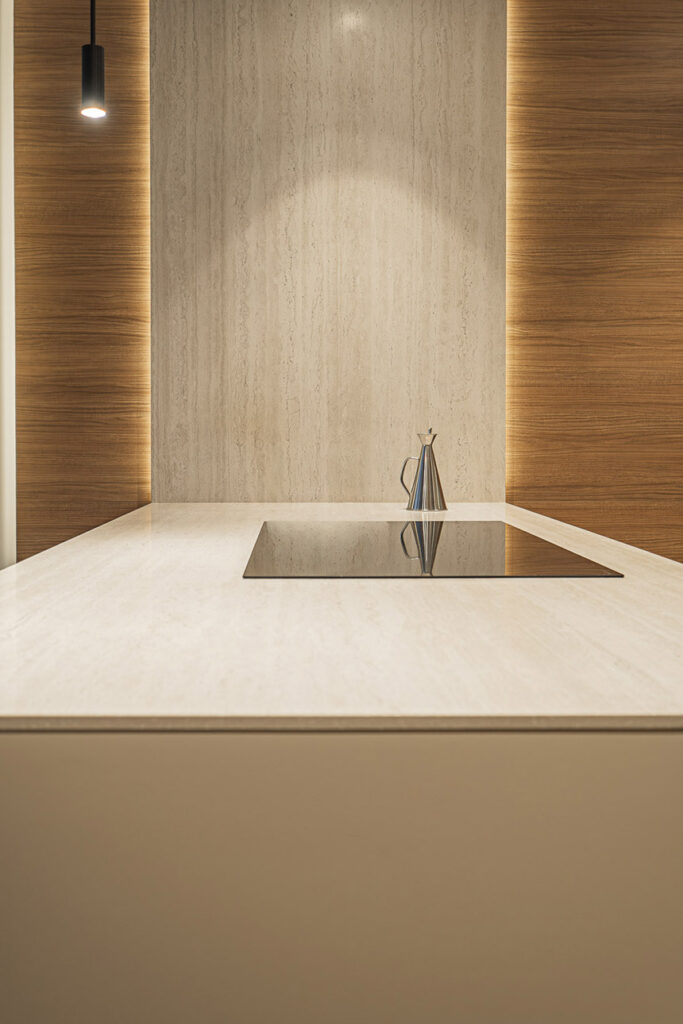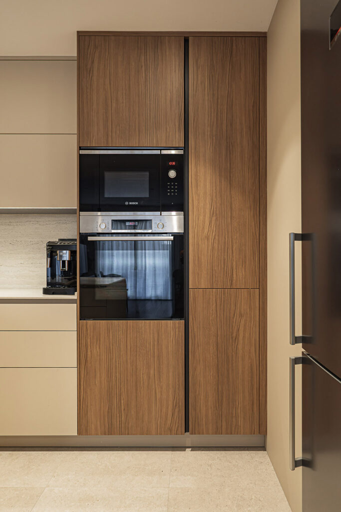 Por su parte, el mobiliario de cocina seleccionado es la Serie 45 del fabricante riojano Dica en acabado Arena Fénix y laminado Roble Dorado. Para la encimera se eligió el porcelánico Lithotech Verso Vein Cut de 12 mm.