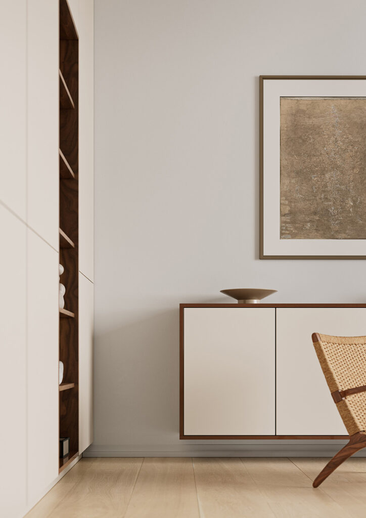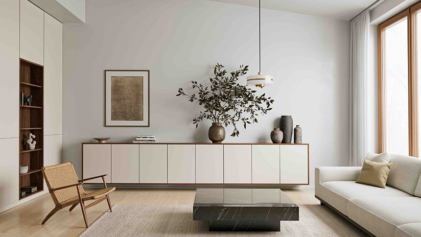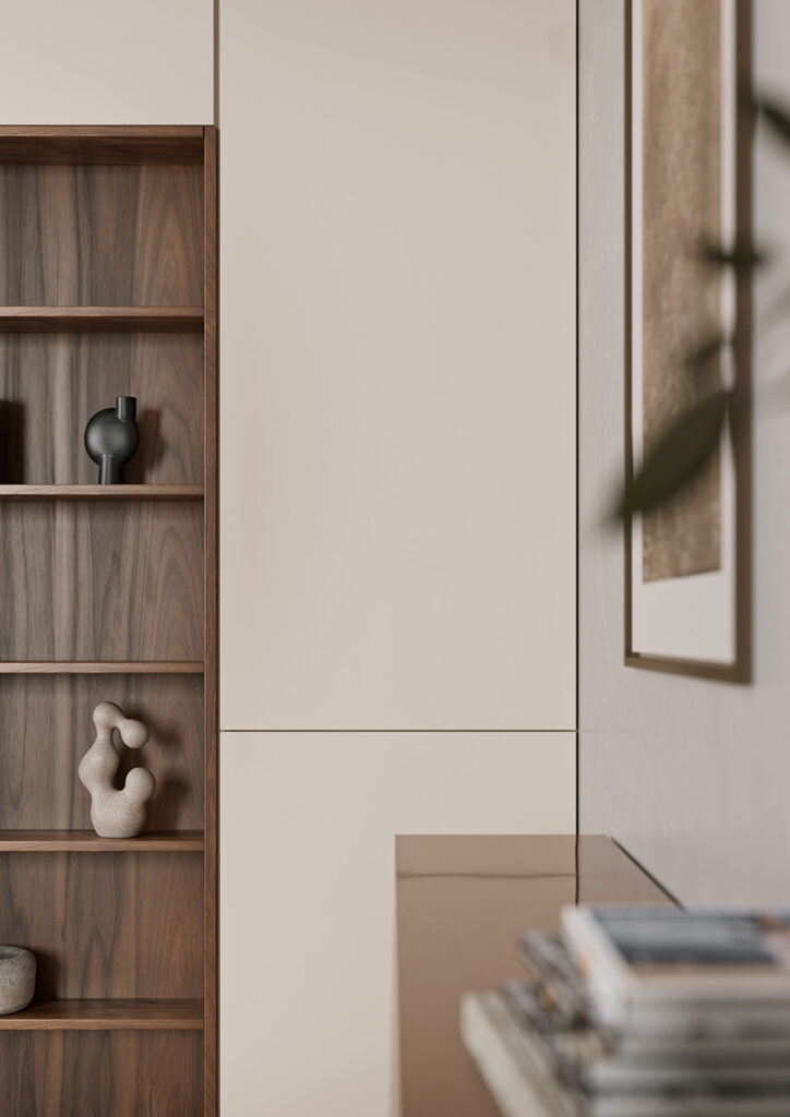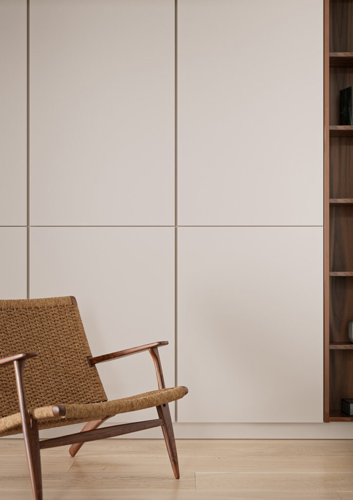 Así, en comedores y salones, Rauvisio se adapta a aparadores, paneles o muebles auxiliares, integrándose armónicamente en espacios abiertos y multifuncionales. Por su lado, en dormitorios y vestidores, su tacto suave y su resistencia al uso cotidiano crean ambientes confortables y duraderos. Además, su tecnología avanzada asegura una elevada resistencia a golpes, arañazos y humedad, lo que hace de Rauvisio un sustituto ideal de los materiales tradicionales, tanto para muebles como para soluciones decorativas verticales.