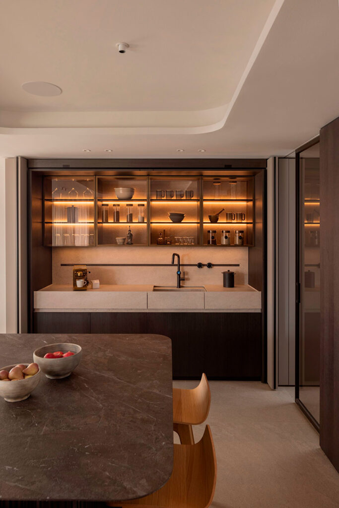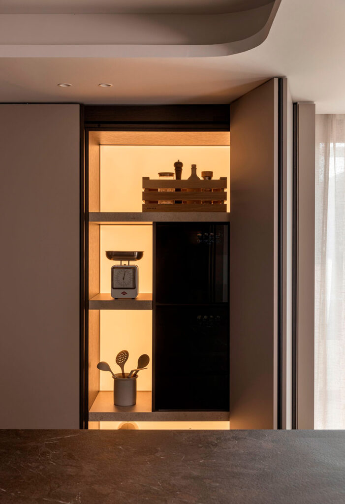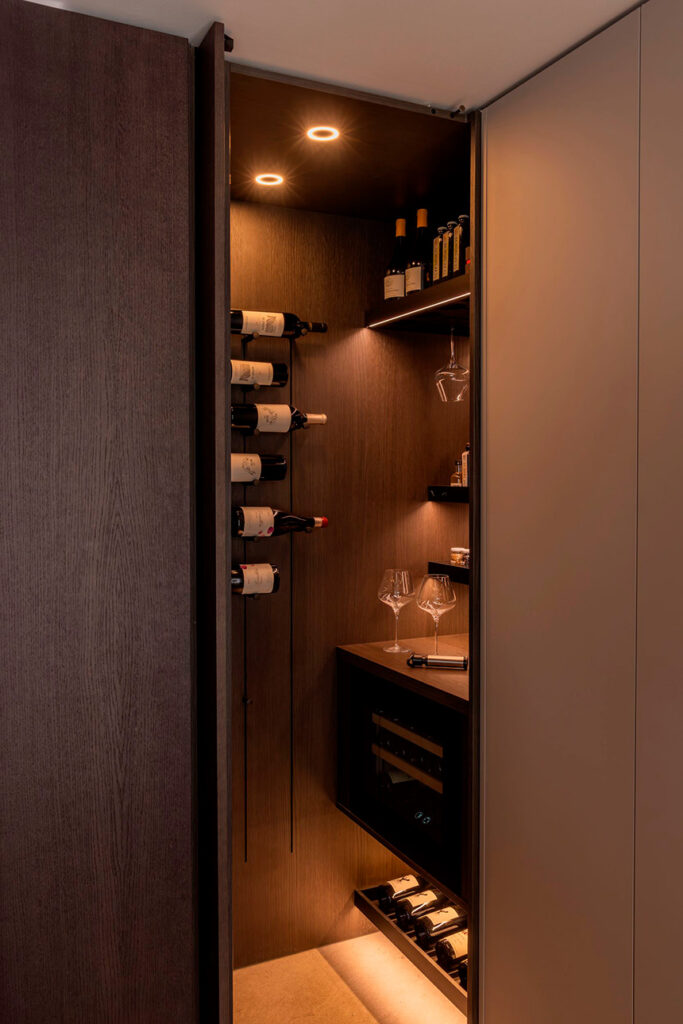 Finalmente, en el punto de encuentro central, se abre un elegante wine cabinet equipado con una vinoteca Dunavox. Este espacio está pensado para acompañar el gesto de servir y disfrutar, celebrando el sabor y la reunión social.