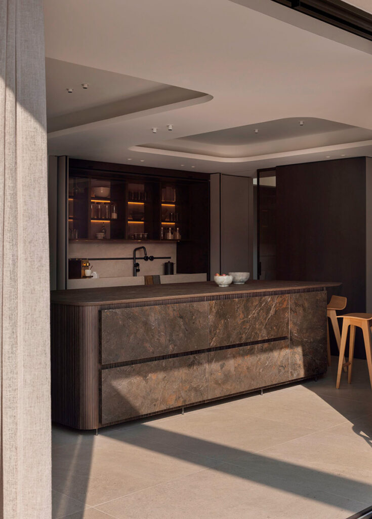 El MDi acabado Petra reviste la encimera esculpida extendiéndose hacia las vitrinas retroiluminadas y creando un gesto ininterrumpido y coherente.