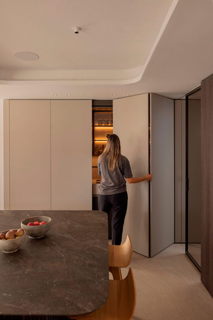 Un sistema de puertas escamoteables controla la presencia de la cocina, ocultándose y mostrándose adaptándose a cada situación. Junto a ellas, una puerta de paso integrada funciona como entrada al lavadero, un espacio resuelto con el mismo lenguaje matérico para conservar la unidad del diseño y facilitar la rutina diaria.