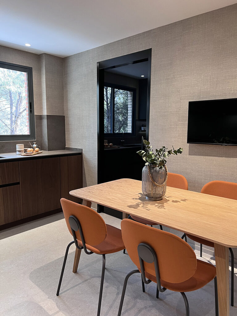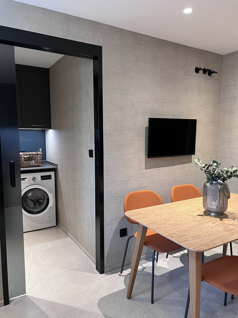 Para los clientes, grandes entusiastas de la cocina, la calidad era innegociable. Por ello, el equipamiento de electrodomésticos es de la marca Miele, reconocida por su durabilidad y alto rendimiento. El espacio se completa con mobiliario auxiliar de diseño español: la mesa y las sillas son del fabricante Ondarreta, ideales para el nuevo rincón de trabajo y socialización. Incluso la galería, que alberga la lavadora y otras máquinas, fue acondicionada para mantener la estética y el diseño vanguardista del conjunto.