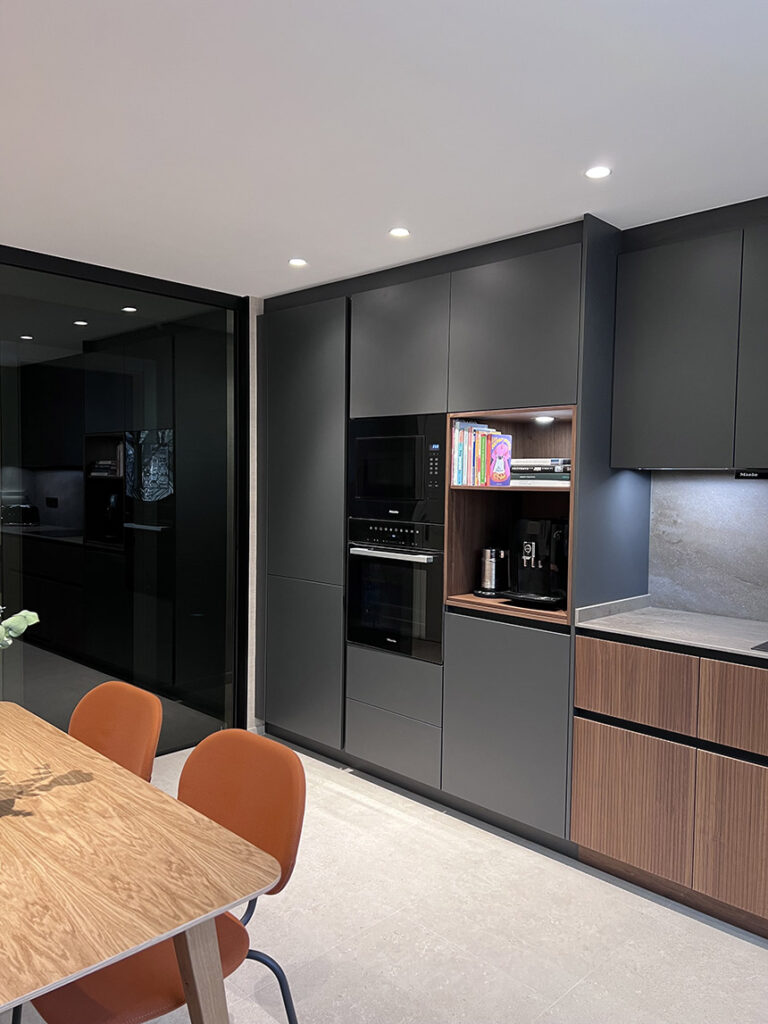 La clave de este proyecto de Sabella reside en la cuidada selección de materiales y una distribución en ‘L’ que optimiza la eficiencia. El mobiliario de la cocina, de la prestigiosa firma Leicht, combina a la perfección la modernidad de una laca mate antihuellas gris carbón (sin tiradores) con la calidez del modelo Bossa en nogal natural. Este contraste se realza con un módulo decorativo de nogal dedicado a la cafetera y una vitrina elegantemente iluminada, creando una atmósfera más hogareña.