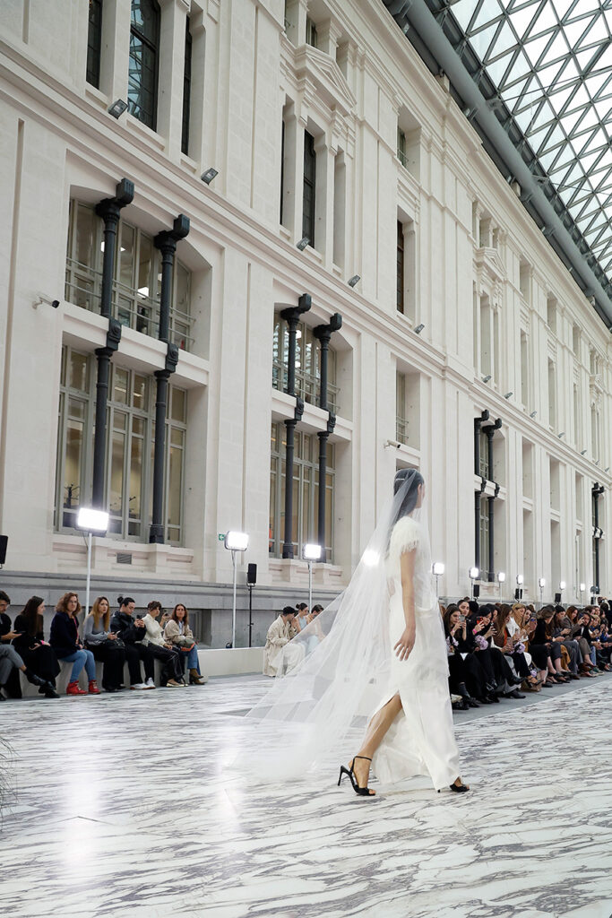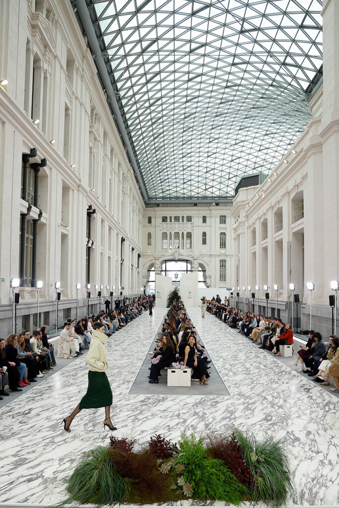 En un contexto donde la imagen actúa como construcción escénica y narrativa visual, la pasarela se convirtió en una superficie sensorial que seguía el ritmo del desfile. Fior di Viola introducía así una dimensión arquitectónica en el fashion show, mediante un juego equilibrado de luz, textura y continuidad visual.
