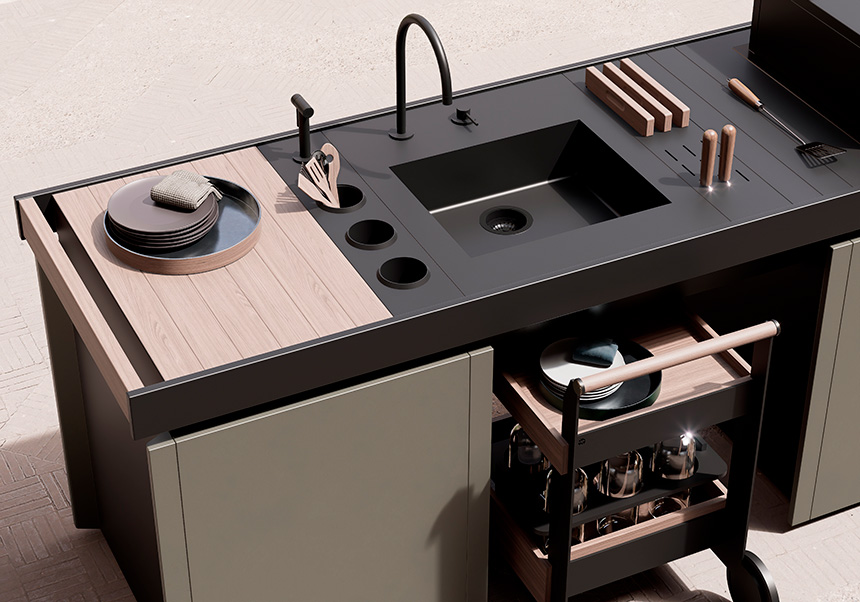 Rossena Outdoor destaca por su gran versatilidad en la composición y su alto nivel de personalización. Su encimera modular permite combinar diferentes materiales y acabados, mientras que los elementos finales y los detalles cuidadosamente trabajados aportan al conjunto una estética geométrica, elegante y sofisticada.