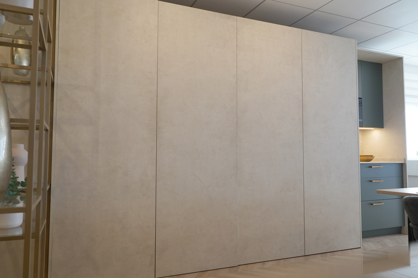 La uniformidad se rompe con un pequeño tramo de estantería abierta, permitiendo introducir piezas decorativas o de apoyo. Como recurso distintivo, introduce un módulo tipo columna que funciona como desayunador y, especialmente, el sistema de doble puerta escamoteable Hawa Folding Concepta III push, que hace posible ocultar totalmente la cocina cuando no está en uso. Al cerrar, el área se oculta a la vista, manteniendo el ambiente ordenado y discreto. La continuidad cromática entre puertas escamoteables y encimera en tono piedra cálido potencia esa integración, haciendo que la cocina se perciba como una parte armónica del espacio sin necesidad de dominar.