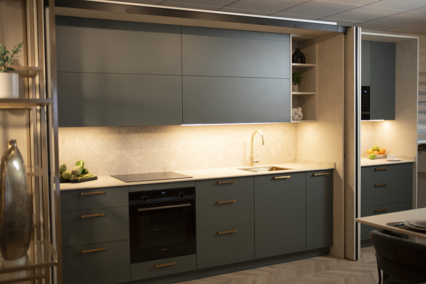 Se trata de una cocina oculta con puertas escamoteables y desayunador con un diseño contemporáneo, minimalista y muy armónica concebida para tipologías donde se prioriza el orden visual. Los frentes en tono verde abeto evocan calma y conexión con la naturaleza. Se combinan con tiradores metálicos en latón cava cepillado que suman calidez. La integración de los muebles superiores y la continuidad de los frentes refuerzan la limpieza visual. A su vez, la distribución inferior se organiza de manera funcional, con el horno integrado en una posición central que favorece ergonomía y uso diario.