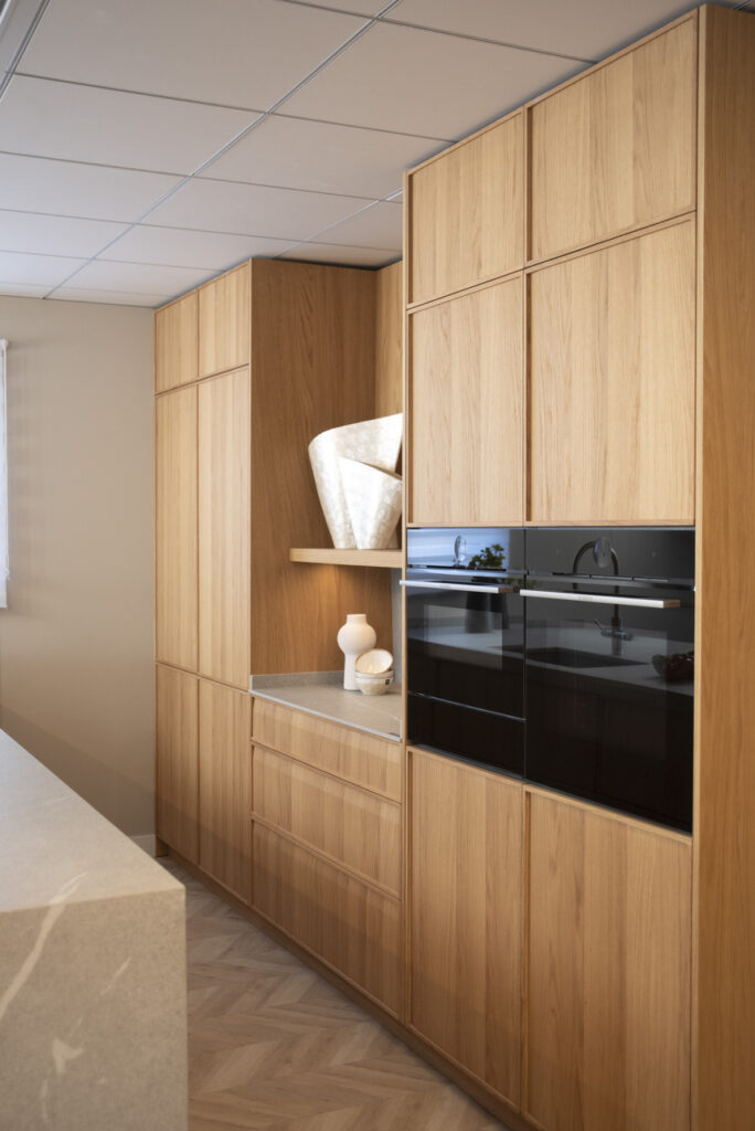 En el apartado funcional toman el papel principal las gavetas de gran formato y los cajones con Vionario V8 Slim de Grass en acabado zirkon, junto con guías Dynapro, que aseguran un deslizamiento preciso, estable y silencioso hasta con carga, brindando una experiencia de uso claramente premium. Una estantería con luz integrada se encarga de otorgar ligereza. Además actúa como punto de apoyo, equilibrando la presencia de las columnas y aportando un gesto más arquitectónico.