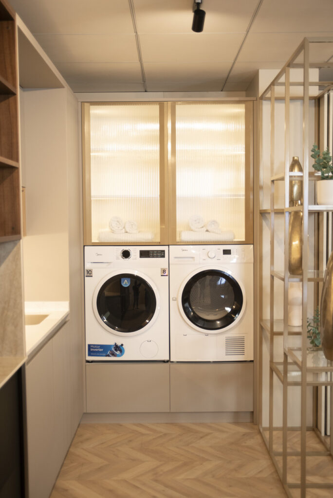 Incorpora frentes de líneas rectas en acabado Arizona (modelo Fenix) combinados con detalles en laminado Roble Miel (modelo Planet), encimera clara con fregadero de acero inoxidable y grifería cromada, y soluciones de almacenaje con estanterías abiertas y vitrinas P8 acabado champán de vidrio acanalado.  La lavadora y la secadora se sitúan en alto para mejorar ergonomía y optimizar el espacio, haciendo más sencillo el uso diario sin renunciar a una apariencia cuidada.