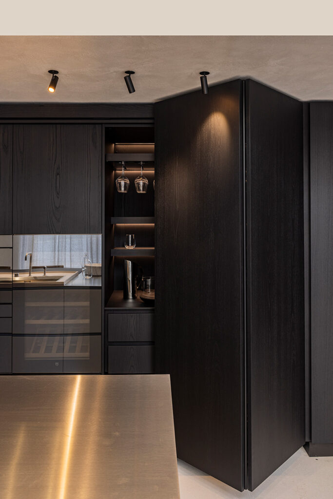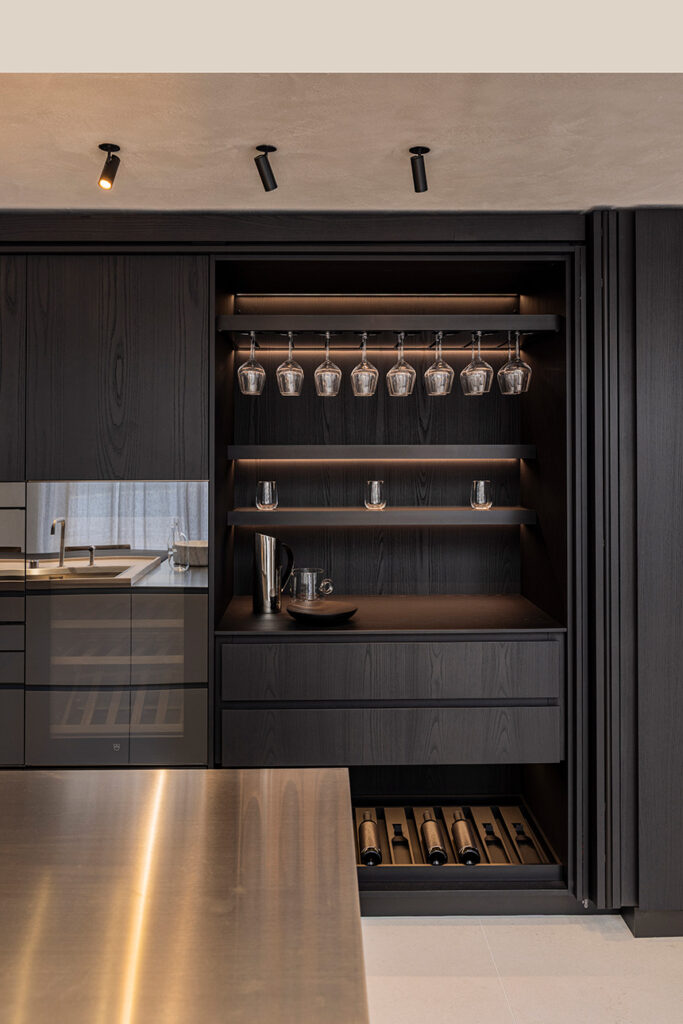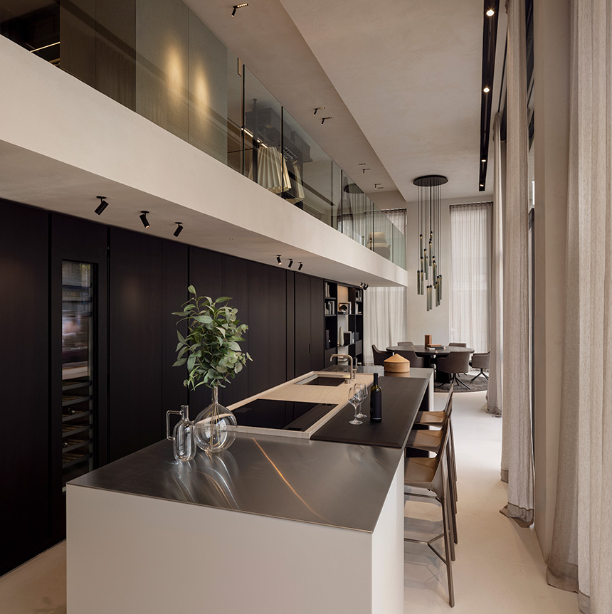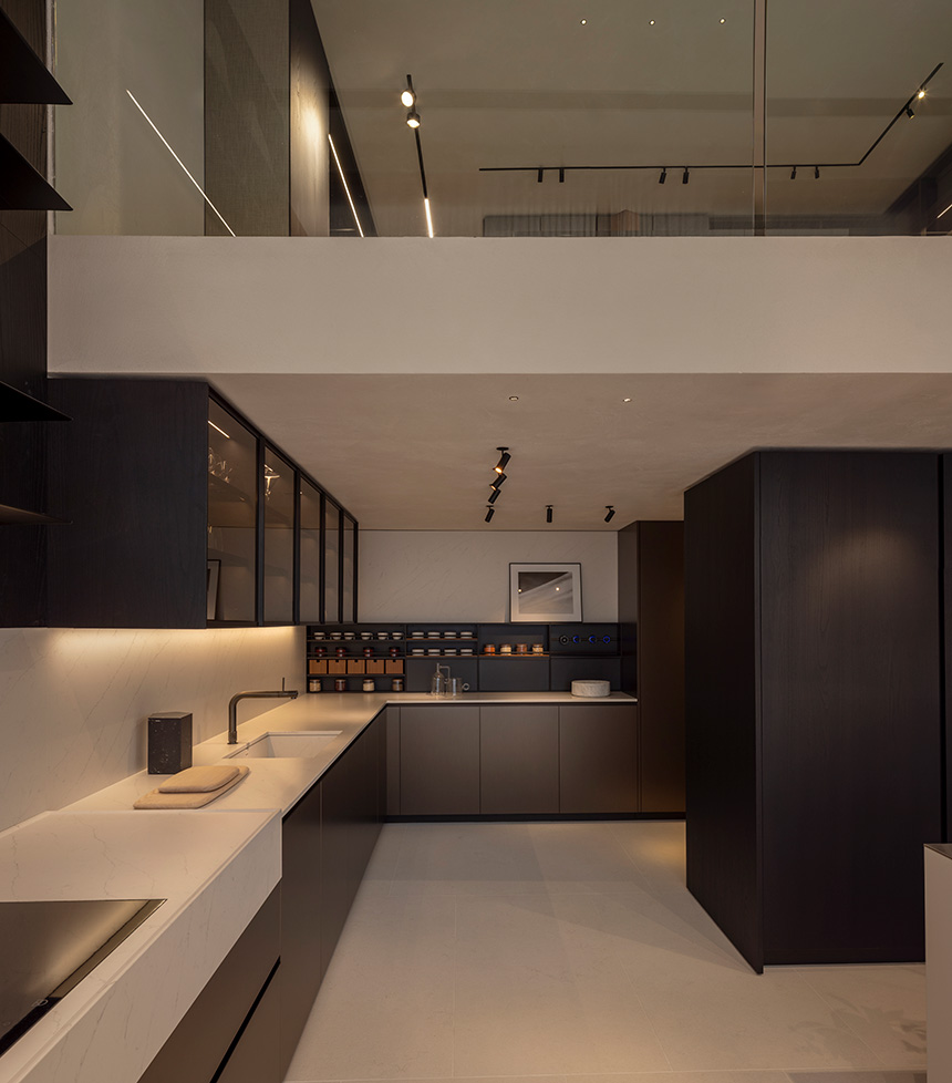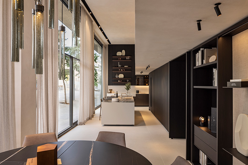 El interior del showroom fusiona un estilo contemporáneo y elegante, con una clara inspiración mediterránea. Las paredes y techos se han revestido en estucado a la cal, en uniformidad con el pavimento. Así, se crea un envoltorio escultórico y homogéneo que destaca las piezas Poliform en tonos oscuros y un lenguaje refinado sofisticado, masculino y sobrio. La iluminación técnica acentúa volúmenes y texturas. Por último, los textiles brindan calidez, trasladando al visitante a una vivienda real.