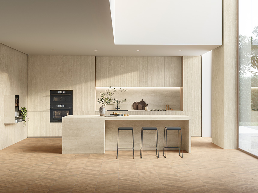 El conjunto se completa con superficies Travertino Navona White para la pared y el pavimento, que refuerzan la continuidad visual y aportan una estética más sobria y refinada. El fondo blanco cálido, recorrido por sutiles vetas tono sobre tono, otorga a la superficie un aspecto armonioso y auténtico.