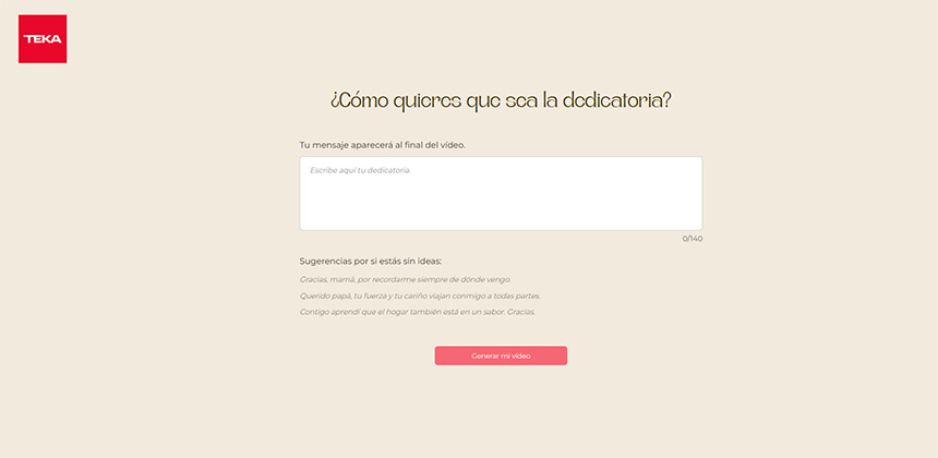 Después de conmover al público con tres historias reales que han conectado con miles de personas, Teka invita a los usuarios a hacer suya la campaña escogiendo la pieza que más le haya emocionado y dedicar el mensaje final del video a alguien especial.