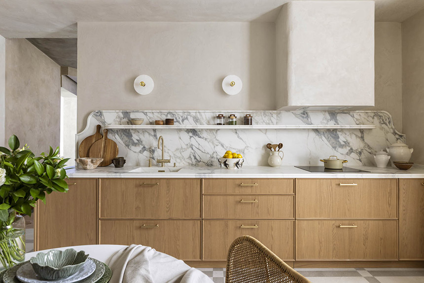 También se llevan los muebles de madera oscura en acabados nogal, chocolate o tabaco, combinados con encimeras claras y/o piezas auxiliares como mesas, sillas, sillones, suelos o detalles rústicos, bañados por la luz natural, y materializados a través de tejidos suaves y naturales como el lino o el algodón, minerales claros y paredes en neutros luminosos.