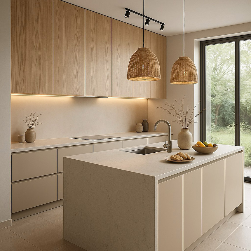 Para ello, este 2026, las cocinas tenderán a ser prácticas, abiertas o semi-abiertas al salón, de manera que, además de a cocinar, inviten a convivir, compartir y a disfrutar en compañía. Asimismo, el acero inoxidable, el excesivo minimalismo, los acabados ultrabrillantes y los laminados poco realistas ceden paso a un enfoque cálido, con toques acogedores. Algo que se consigue gracias al empleo de materiales naturales y sostenibles como la madera o las piedras con vetas pronunciadas y acabados en tonos neutros protagonistas de un estilo elegante y agradable.