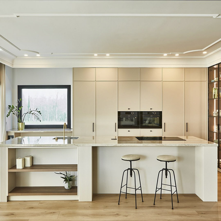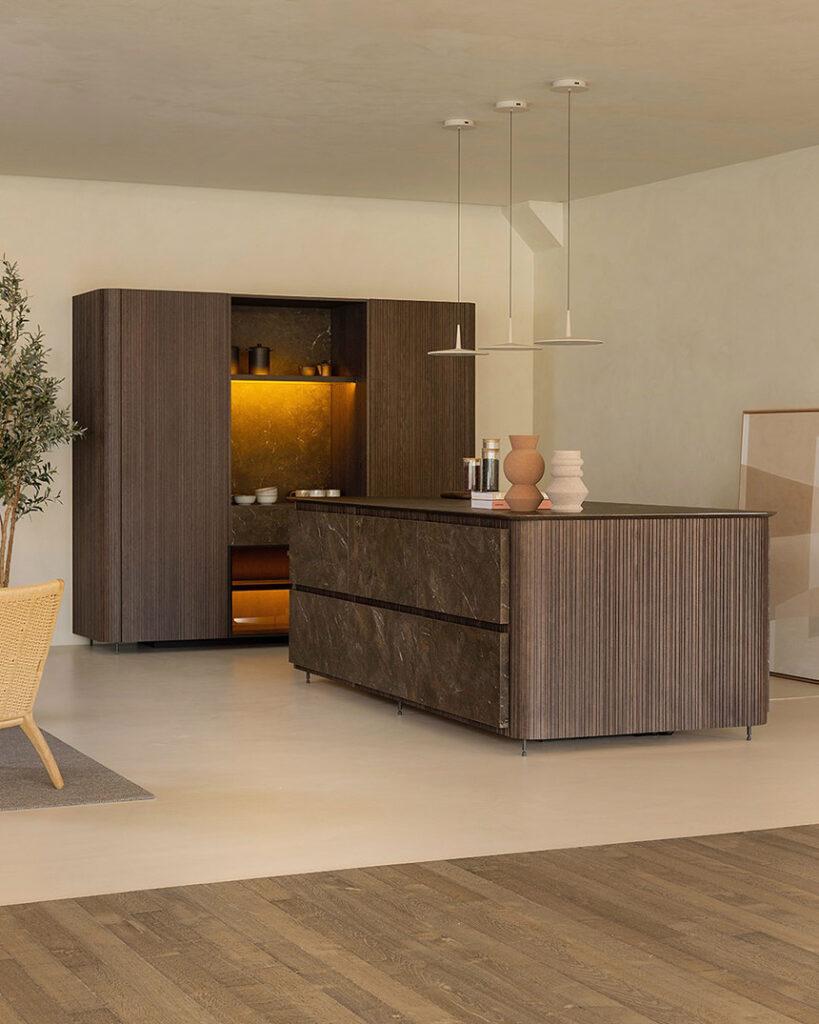 El espacio de almacenaje sigue siendo prioritario. Por ello, las propuestas de almacenamiento inteligentes incluyen opciones en columna o integradas en la propia isla, que mantienen la superficie despejada; gaveteros bajo encimera; armarios hasta el techo que aprovechan cada centímetro y despensas de gran capacidad.
