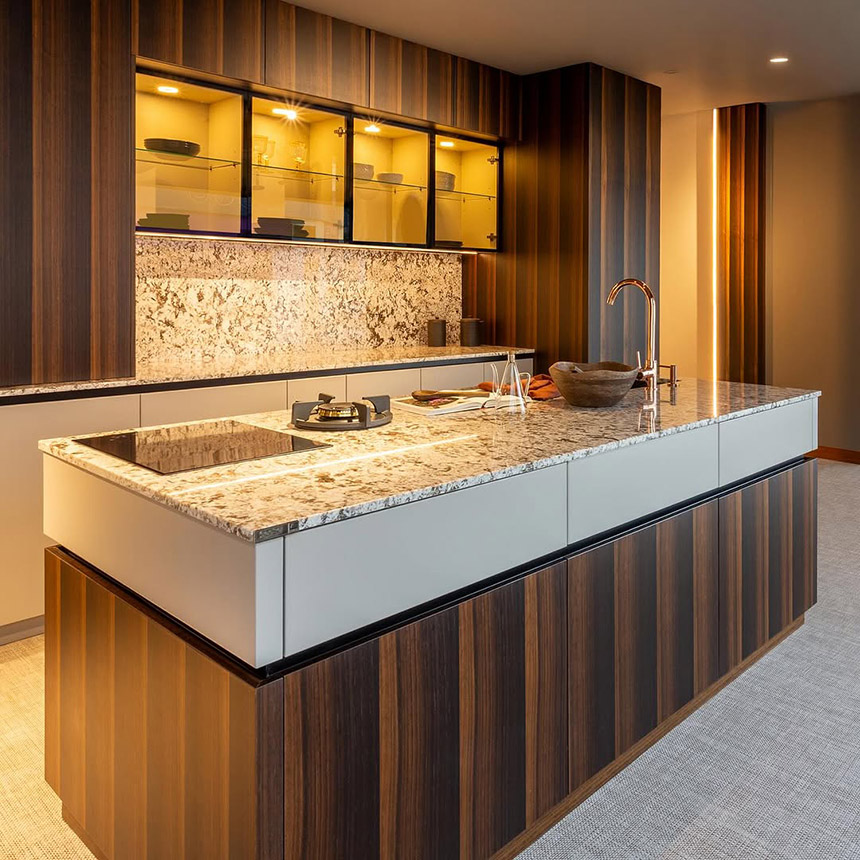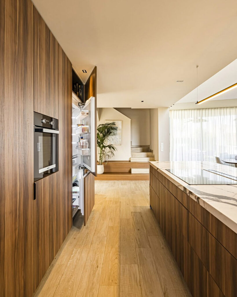 La integración de electrodomésticos escamoteables (también hornos y microondas) ayuda a lograr un diseño más limpio y visualmente despejado. Esto contribuye a la idea de cocinas “invisibles”, donde prevalece la funcionalidad sin desorden.