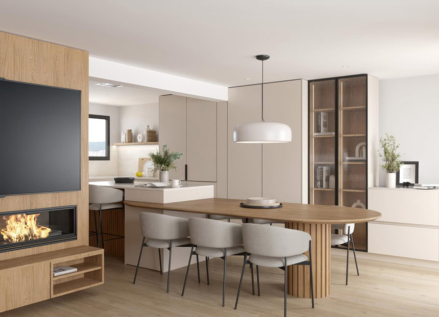 En este contexto, la implementación de islas y penínsulas facilita la transición entre ambas estancias y la coherencia en materiales y colores proporciona sensación de fluidez visual y continuidad espacial. El objetivo es crear un ambiente que se integre armoniosamente con el resto del hogar, sin sacrificar la funcionalidad por lo que la planificación del espacio es esencial.